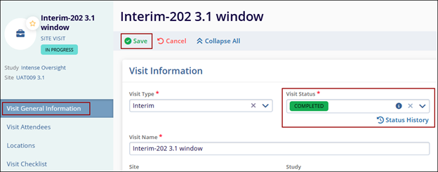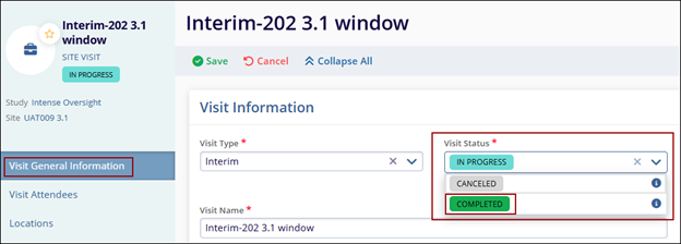 - Select the ‘Completed’ status from the ‘Visit’ status dropdown.