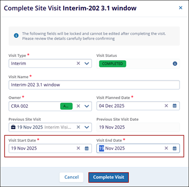 On the Complete Site Visit (visit name) window, enter the Visit Start & End Dates and click the Complete Visit button.