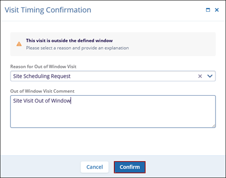 If the visit Start and End dates are mentioned earlier than the planned date, the Visit Timing Confirmation window is displayed.