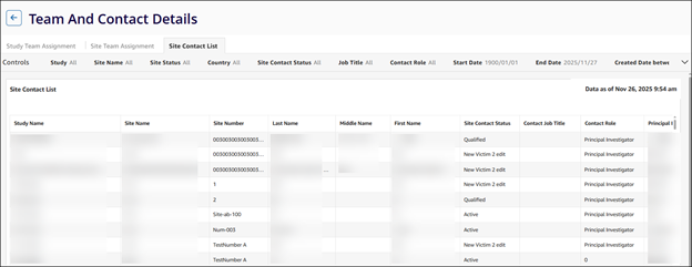 The Cross Study Team Assignment dashboard displays a comprehensive, domain-level view of study team assignments across all studies within the customer’s domain/CTMS. The dashboard consolidates data from multiple studies and displays it in one place.