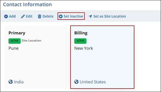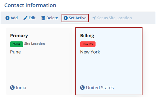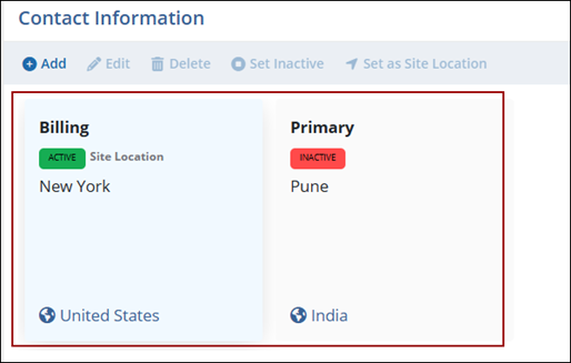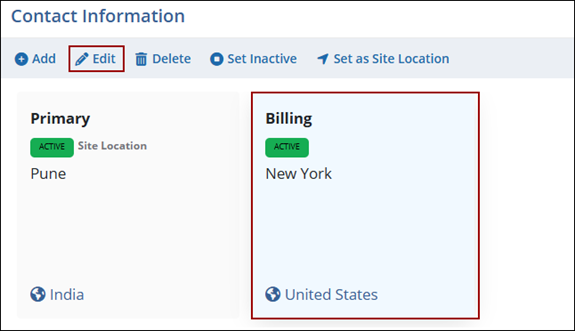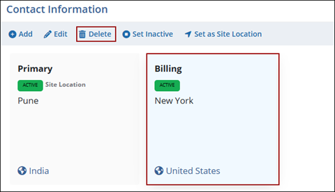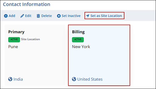 The newly added address is then set as the site location, and the existing primary address is automatically set to inactive.