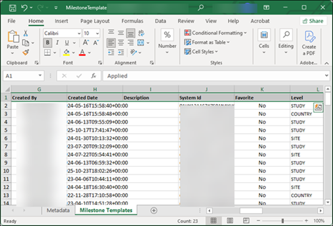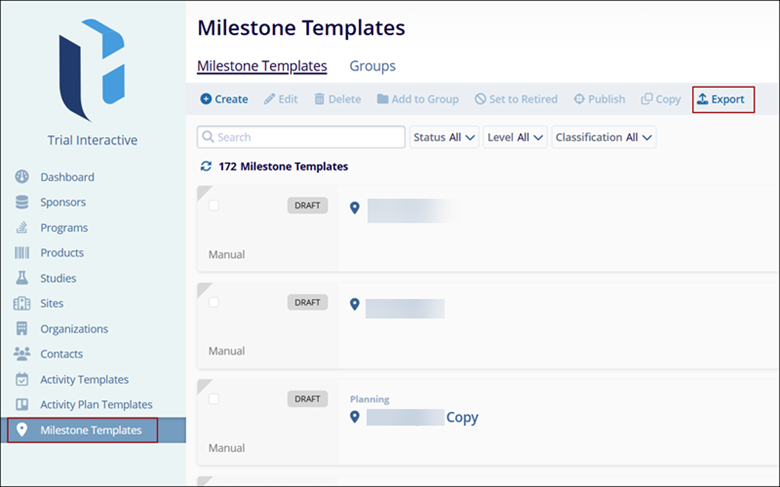 Users can export a list of all Milestone Templates within the Milestone Templates library that have been created within the CTMS.
