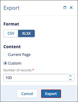 - Custom: Here, specify the number of records to be exported by either clicking on the up and down arrows or entering the number of records since it is a free-text field.