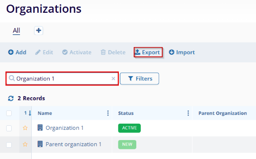 - On the Organizations tab, click on the Export button from the top menu bar.