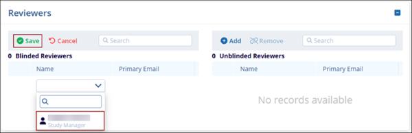 Reviewers are members of the study team responsible for reviewing, approving, or rejecting site visit reports. They must be assigned before any reports can be generated for the study. Within the Reviewers section, users can designate both blinded and unblinded reviewers. A single user may serve as a blinded or unblinded reviewer, but the user must be separately added in the Blinded and Unblinded Reviewers section.