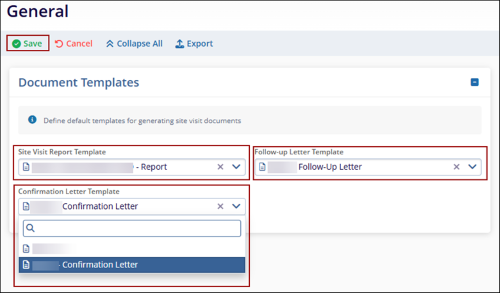- From each dropdown menu, select the appropriate option for the following templates: Site Visit Report Template, Follow-up Letter Template, and Confirmation Letter Template.