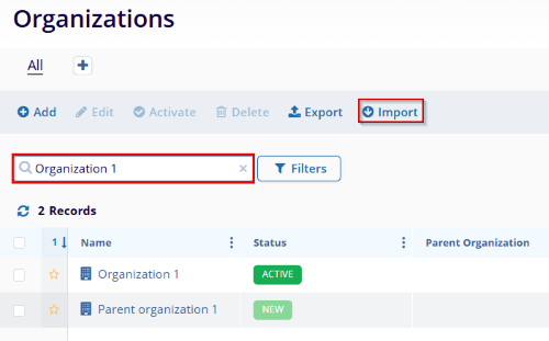 - On the Organizations tab, click on the Import button from the top menu bar.