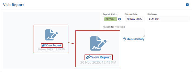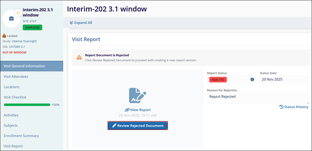 - Navigate to the Visit Report section, click the ‘Review Rejected Document’.