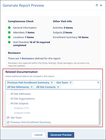 - The site visit owner can indicate whether enrollment statistics from the previous visit should be included in the site visit report.