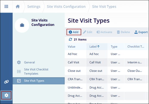 To add a site visit type, navigate to the Settings area and go to the Site Visit Types option and follow the steps below: