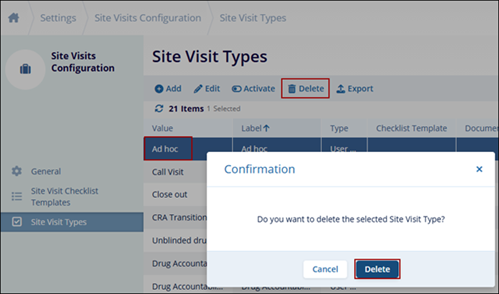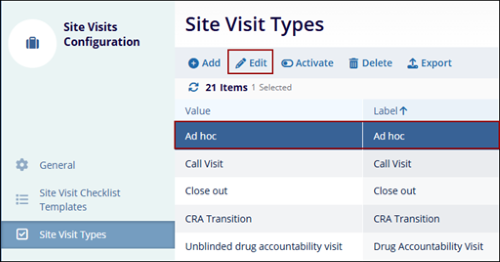 - To edit, activate, deactivate, and export the Site Visit Type details, follow the steps mentioned in the relevant sections above.