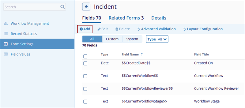 - Navigate to the ‘Fields’ tab of a form, e.g.,
