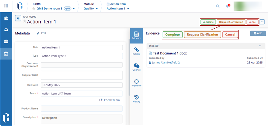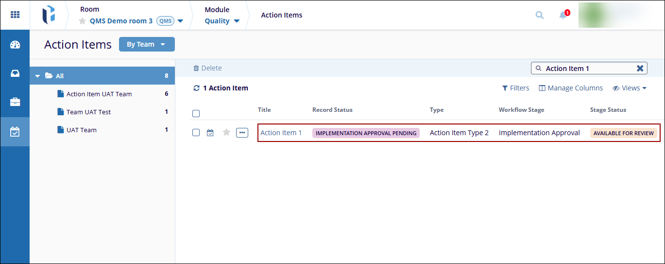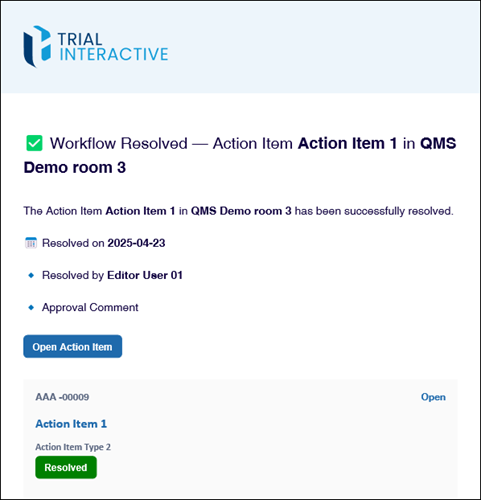 When an Action item enters the approval workflow, the designated authorities are responsible for advancing the record through each stage until it reaches the final stage. At the final stage, a user (typically an Approver) reviews and approves the record, thereby resolving it.