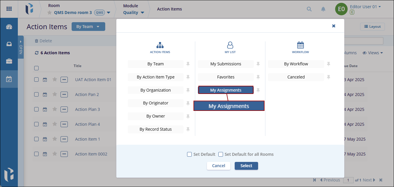 - Additionally, users can access the Action Item assigned to them by setting the My Assignments view from the dropdown at the top.