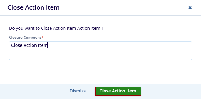 - On the ‘Close Action Item’ popup, mandatorily add a