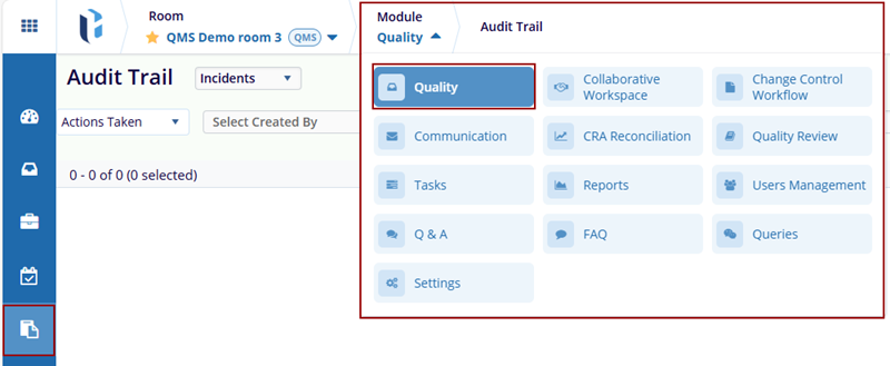 - Navigate to the Quality module within the QMS room, or click the Module dropdown and select the Quality module option.