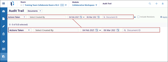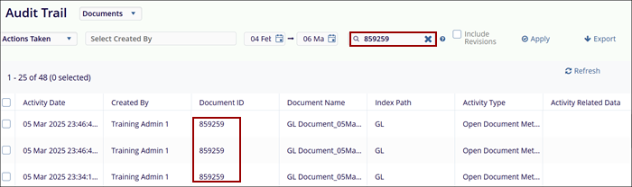 - Document ID Filter: The Document ID field allows users to retrieve audit trial for a