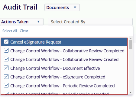 menu for filtering the audit trail as per the selected parameter. The Actions Taken dropdown