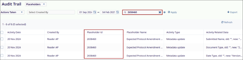 - Placeholder ID: The Placeholder ID field allows users to retrieve audit trial for a