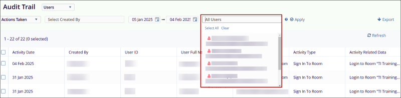 - All Users: The All Users filter allows users to retrieve audit trails for