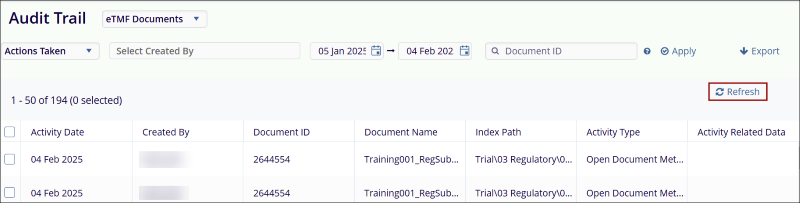- Refresh: The Refresh button is visible and accessible when the audit trail results