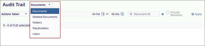 Users can retrieve the audit trail based on selected parameters. The options in the Actions Taken dropdown are displayed according to the chosen parameter.