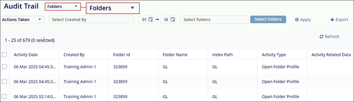 Folders: When the audit trail for Folders is retrieved, the data is presented in the following columns.
