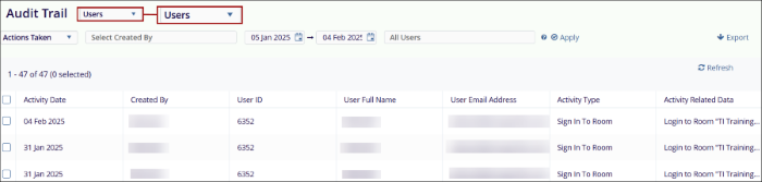- Users: When the audit trail for Users is retrieved, the data is presented in the