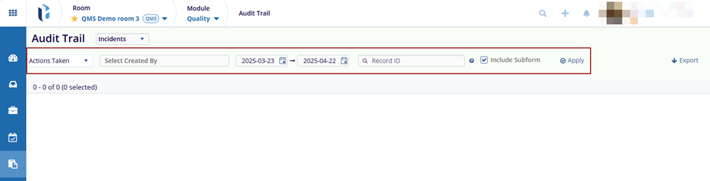 - The Audit Trail screen displays data based on the applied filters and parameters.