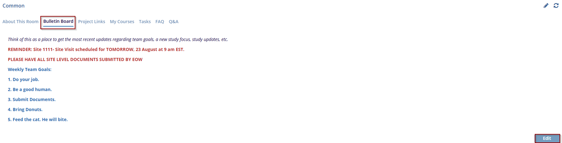 The Bulletin Board tab is set up by administrators to provide important messages and updates to the team. It can include information related to the room, study-related announcements, or updates about any issues or actions needed. This section serves as a central communication hub for keeping all team members informed. Both Administrators and Managers have permission to edit the content in this area, ensuring that relevant information can be updated as needed.