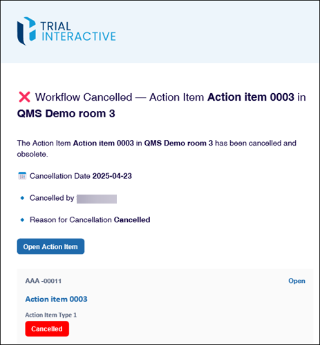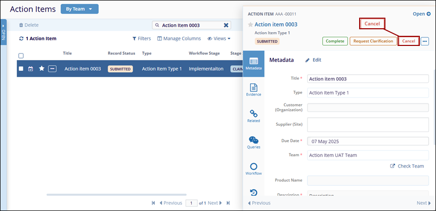 Authorities in the workflow stages can cancel an Action Item record depending on the configurations in the workflow stages. Once an authority cancels an Action Item, the record is removed from the workflow.