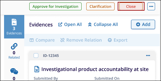 (Refer to Screenshot - The ‘Close’ button appears along with other action options like ‘Approve for Investigation’ and ‘Clarification.’)