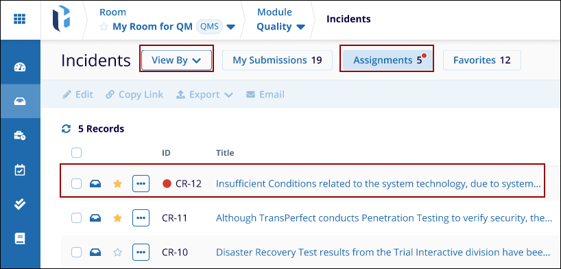 - Click the Incidents icon in the left navigation panel to open the Incident screen.