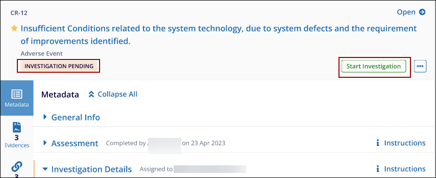 - Click the Start Investigation button at the bottom of the pop-up window to initiate the Investigation.