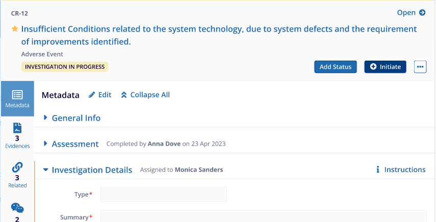 After an Incident is claimed and completed by the assigned Process Owner during the Assessment Stage, it transitions to the Investigation Stage.