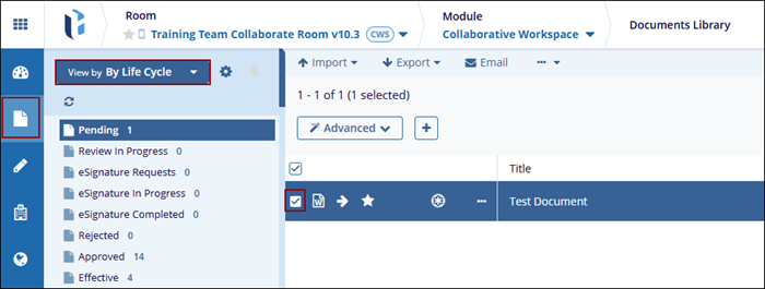 - Navigate to the Documents Library modal, and set the view to ‘Document Life Cycle’.
