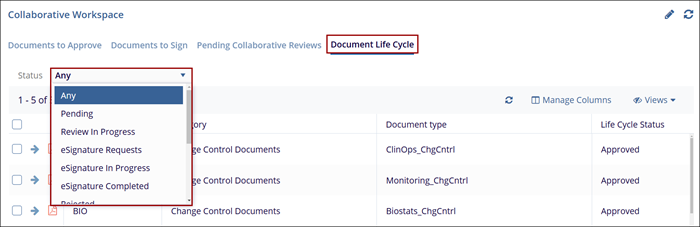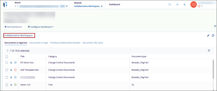 The Collaborative Workspace group of dashlets is exclusive to TI Collaborate rooms and includes dashlets that provide users the visibility and access to documents required to be approved and electronically Signed. Additionally, users get clarity on the pending collaborative reviews and the document life cycle.
