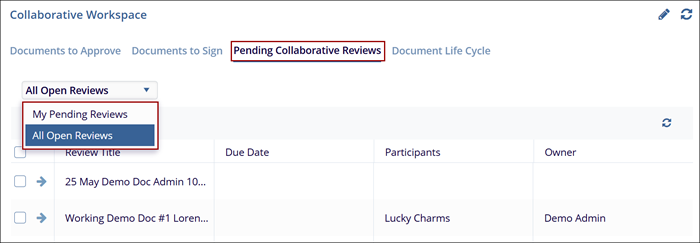 Users can choose to view the documents pending review for All users (default) by selecting the All Open Reviews option. Additionally, users can select the My Pending Reviews option to view documents only for themselves.