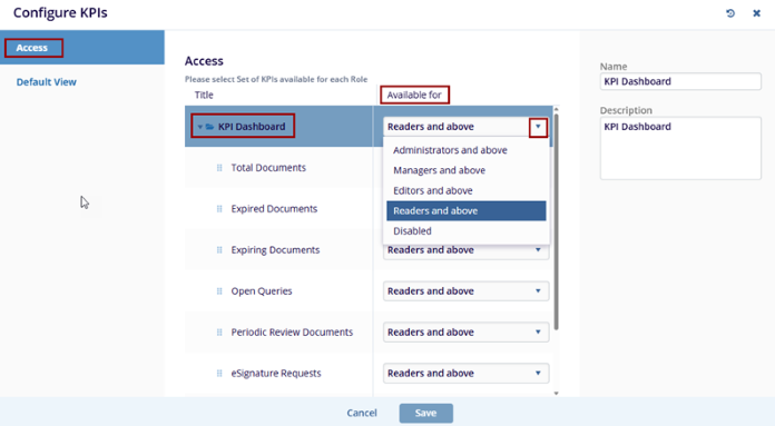 - On the Access tab, expand the KPI Dashboard fields using the arrow and select the