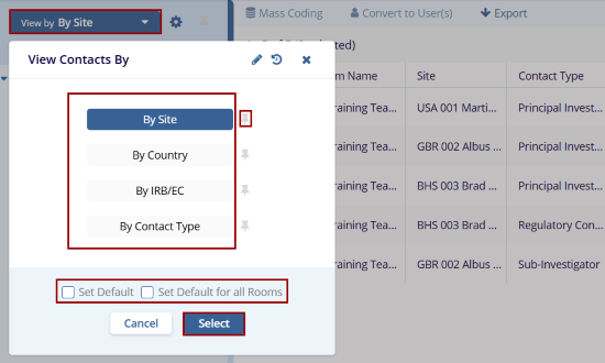 - Click on the pin icon to pin a view and this view is selected once user access the Contacts modal.