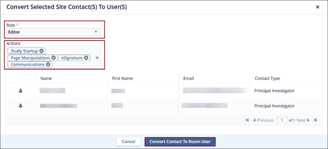 - On the Convert Selected Site Contact(S) To User(S) window, click on the Role* dropdown and select Editor or Reader.