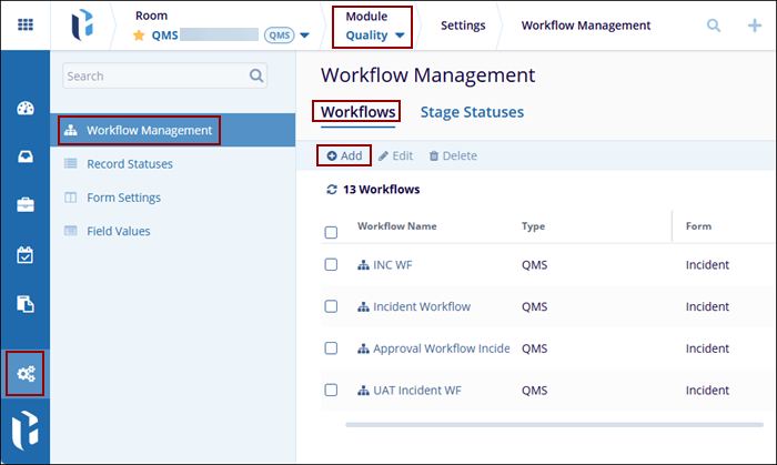 - From the Quality module, click on the Settings menu > Workflow Management > Workflows tab.