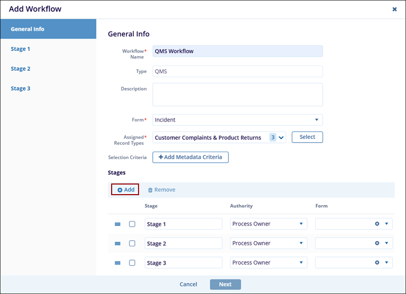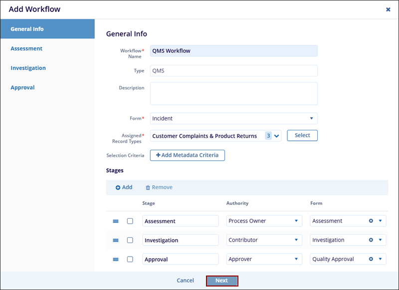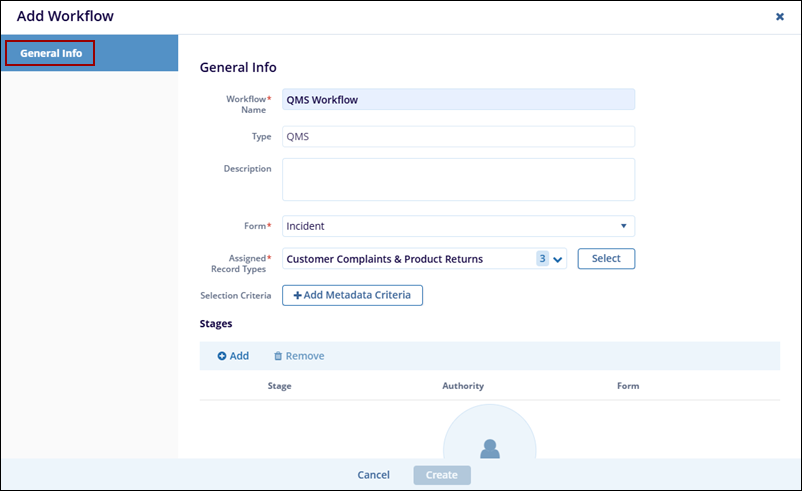 - Type: The workflow type ‘QMS’ is auto-populated and non-editable.
