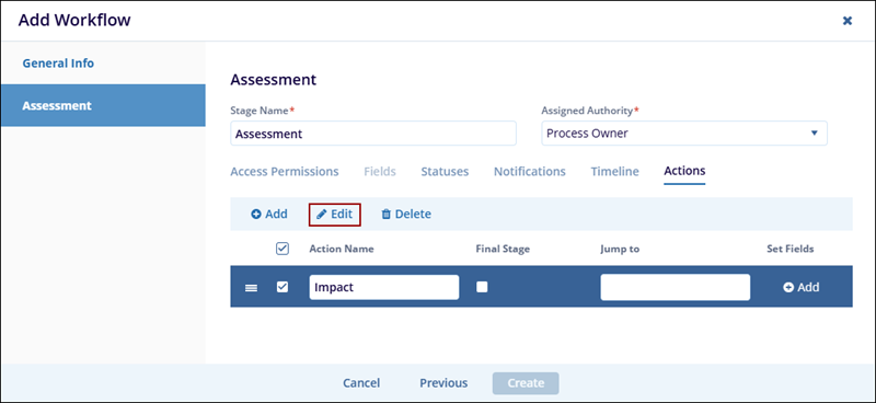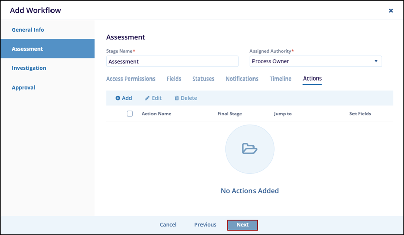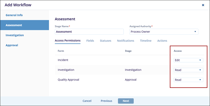 This tab allows Admins to define read/edit access for the assigned authority to the main form (e.g., Incident) and related forms (e.g., Investigation, QA) during the stage. These permissions define whether the assigned authority at a specific stage can view or modify the record, either within the current stage or across other stages, depending on the configuration.