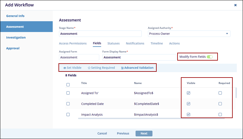 - Select individual fields to update their visibility, mark them as setting required, or apply advanced validation rules.