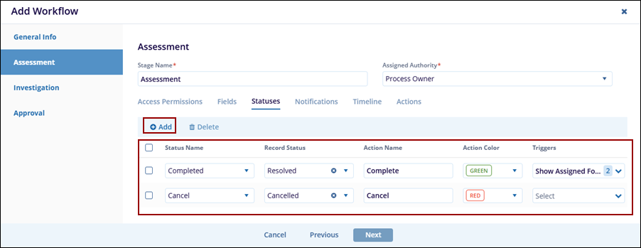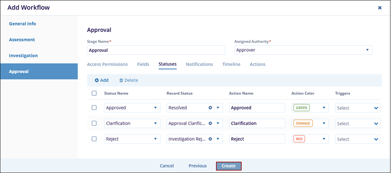 The Statuses tab allows Admins to define the statuses that can be applied during a particular stage.