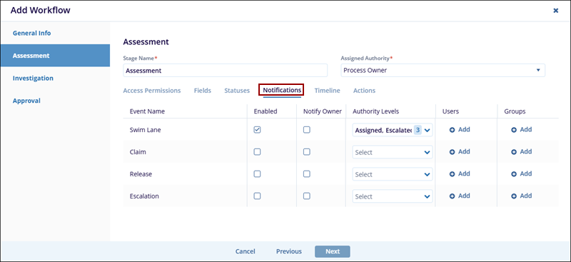 The Notifications tab allows workflow creators to select users, groups, and authority levels who will receive the notifications and under what circumstances at a specific workflow stage for the following notification types.