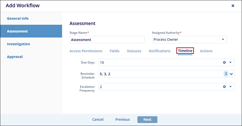 The ‘Timeline’ tab allows users to define the due days, reminder schedule, and escalation frequency to ensure timely task execution and support automated follow-ups and escalations to maintain workflow efficiency and accountability.
