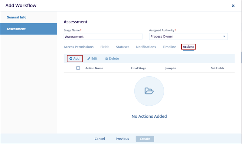 The Actions tab enables the configuration of automated custom actions based on specific field values in the assigned form. These actions are triggered dynamically during stage processing to guide workflow logic or transitions.