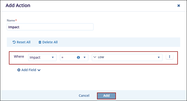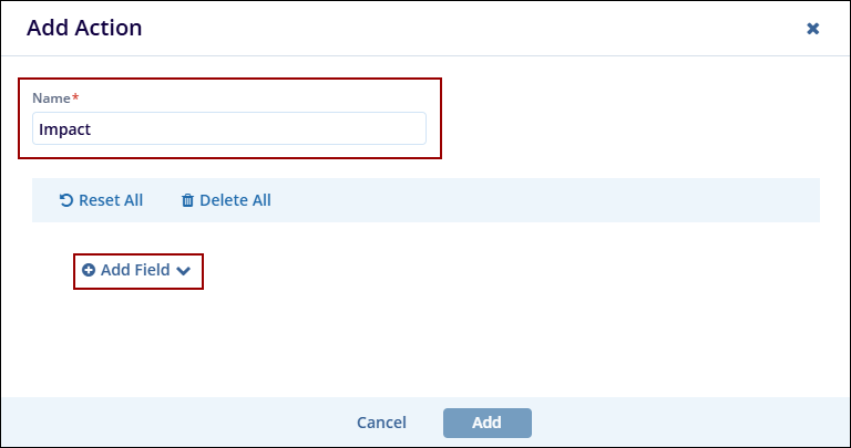 - On the Add Action modal window, provide a name to the action and click on the +Add Field button.